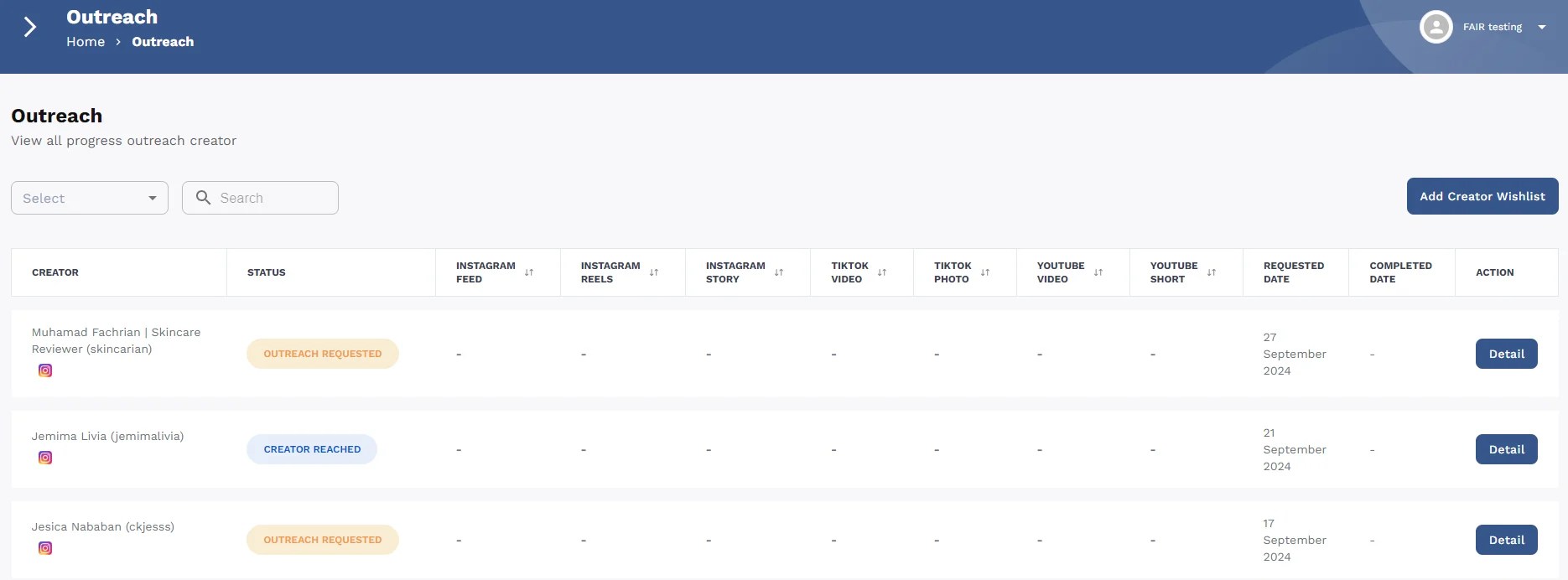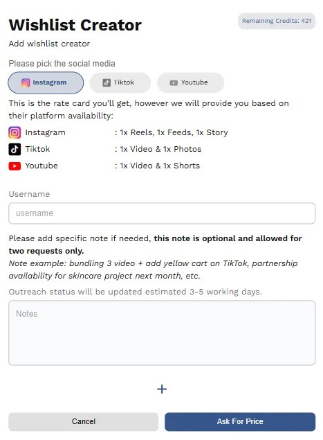 Add Creator Wishlist by entering the username or platform of the required influencer. You can also include special requests in the notes section, such as video content type or availability in the next month. You can add more than one influencer in a single submission, but each request will deduct your credits. This process takes 3-5 days from the time the request is submitted.